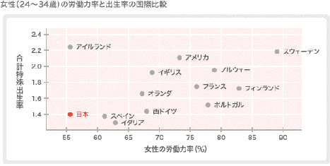 しかし、日本は、世界と比較すると女性(24~34歳)の出生率も労働力率も低い位置に甘んじています。