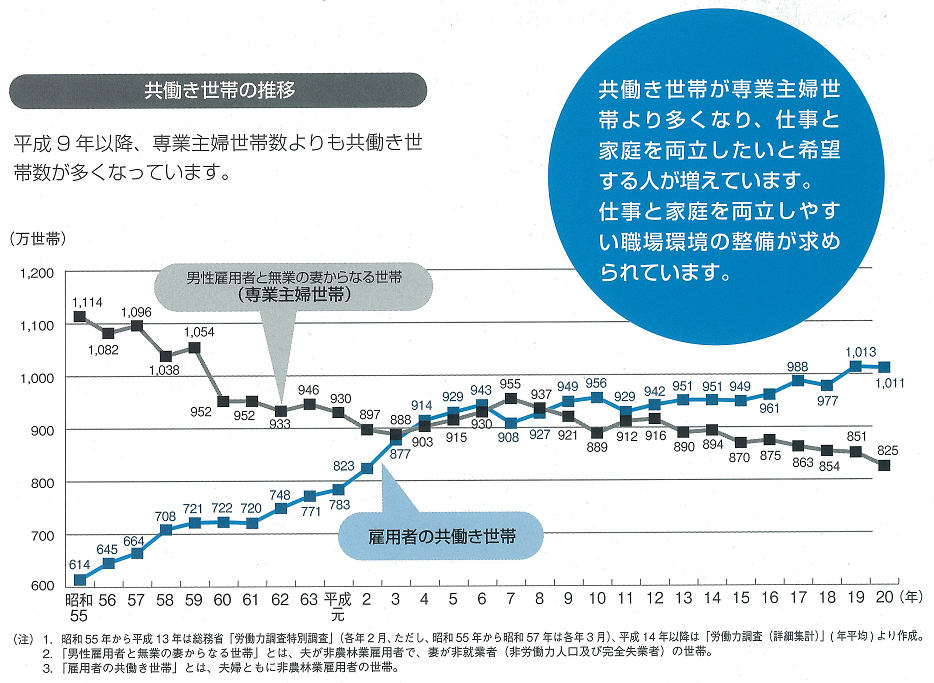共働き世帯が専業主婦世帯より多くなり、仕事と家庭を両立したいと希望する人が増えています。